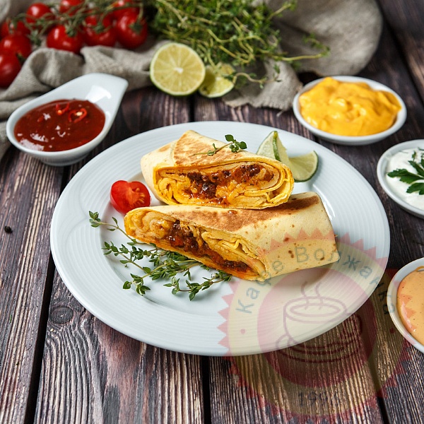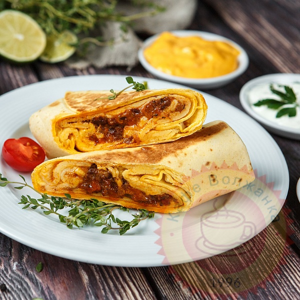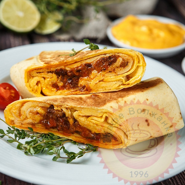 Сырная торлилья, нежный омлет, фарш карне пикада, сливки. Подаётся с соусом на выбор.